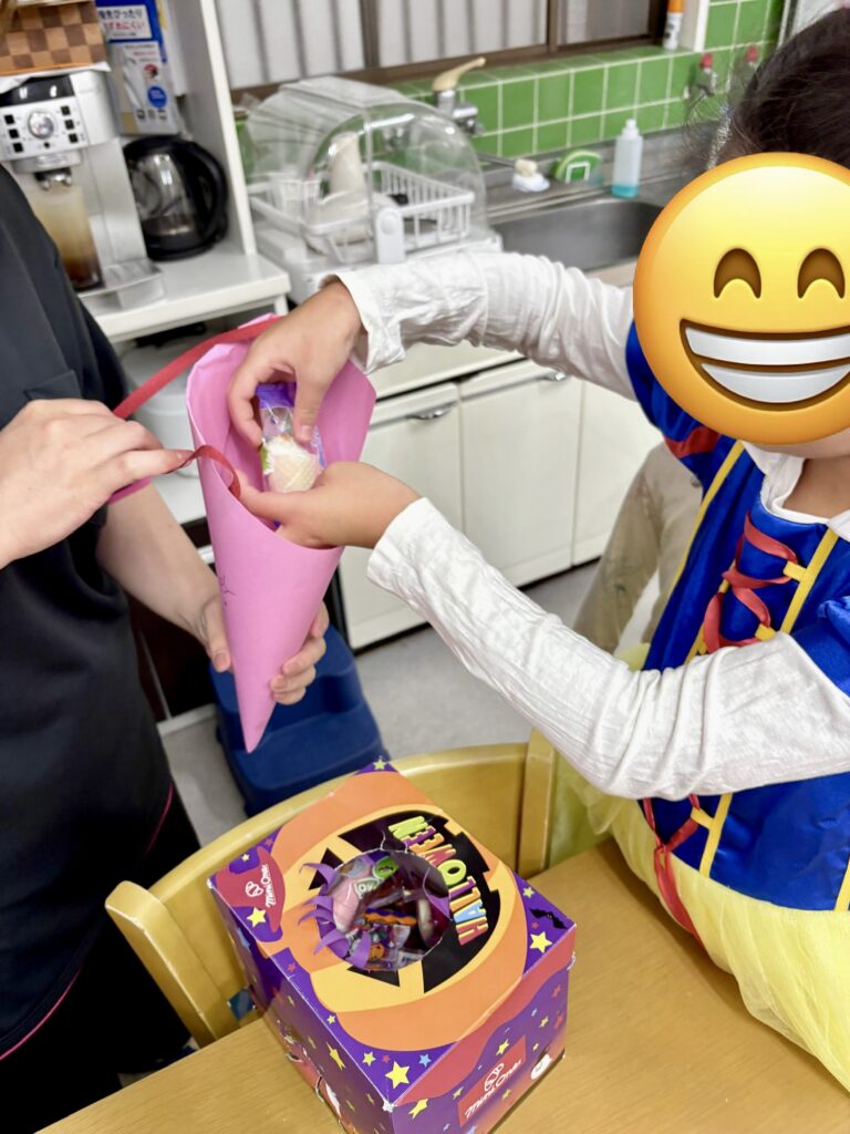 「トリック オア トリート!」と声を出して、袋いっぱいにお菓子を詰め込みました。