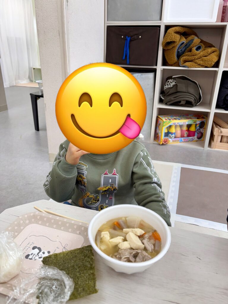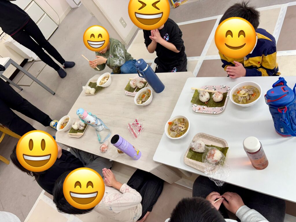 完成した豚汁とおにぎりを並べて、みんなで「いただきます」。