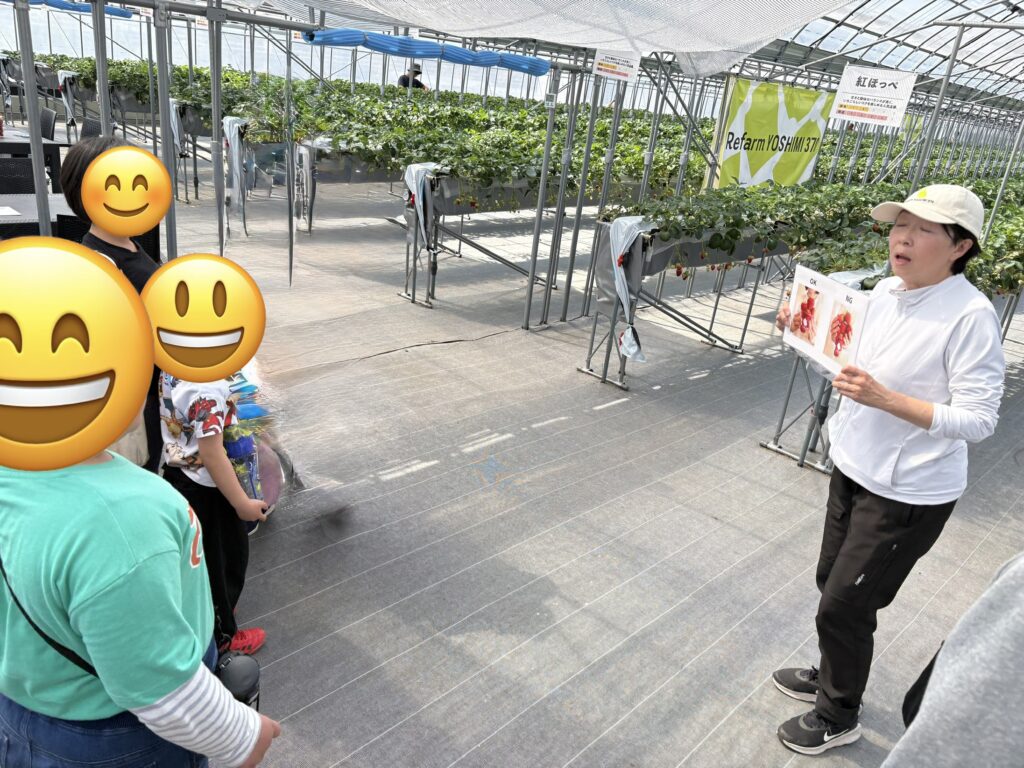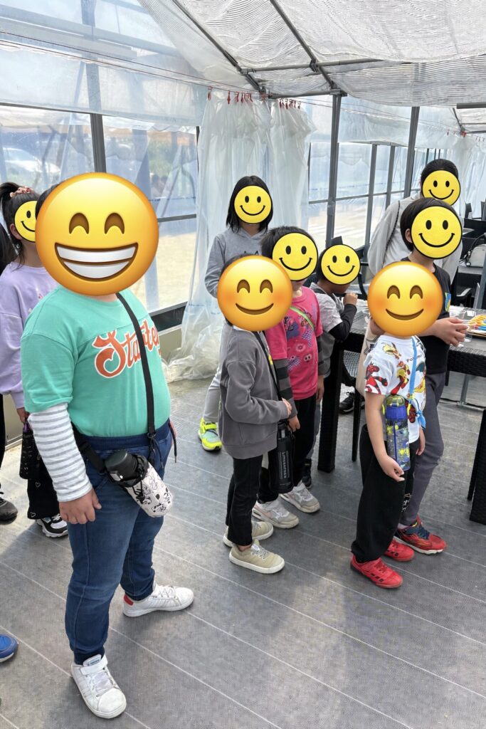 ハウスに入る前に、まずは職員さんからいちごの取り方やルールについてしっかりとお話を聞きました。みんな真剣な表情で耳を傾けていて、「上手に取るぞ」という気持ちが伝わってきました。