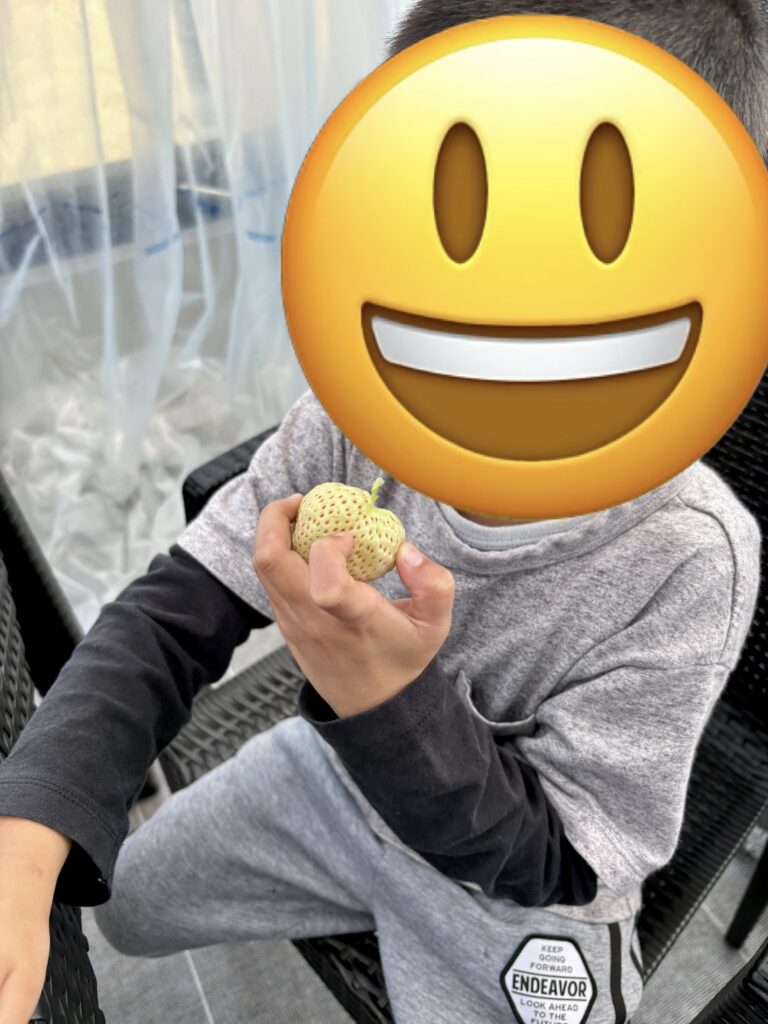 「これがいい」「こっちの方が大きい」と、色や大きさを見比べながら、自分なりのお気に入りを見つけていきます。真っ赤に実ったいちごを選ぶ子もいれば、白いいちごに挑戦する子もいて、それぞれの個性が光っていました。